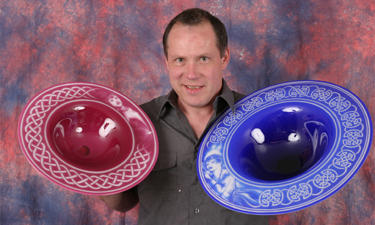 Steve Bradley creates many diverse pieces of art glass, from full size glass musical instruments to cameo engraved artworks. Steve’s influences come from many sources. Whilst working at the ‘Royal College of Art’ in London, he benefited from working alongside Sculptor, Sir Eduardo Paolozzi. Other influences for his cameo pieces were works produced by the ‘Woodall Brothers’ at the ‘Thomas Webb’ factory.