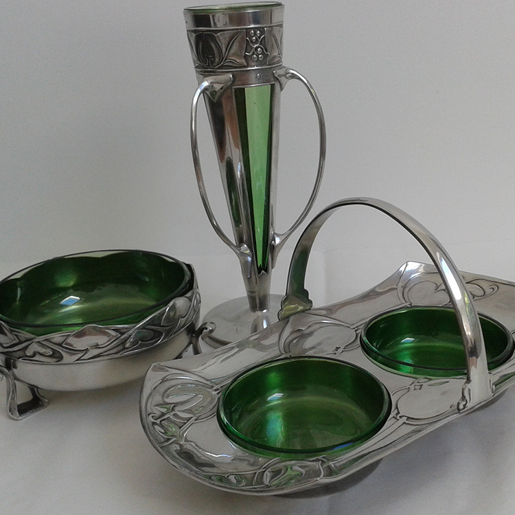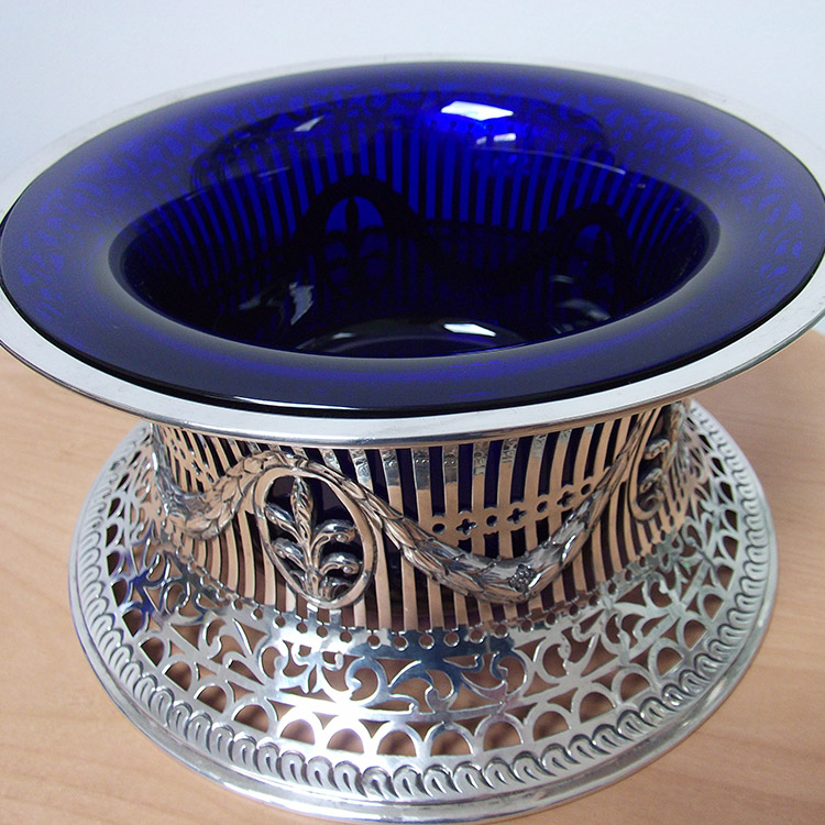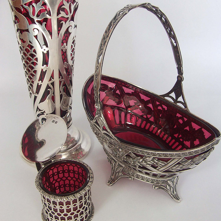 salts, baskets, inkwells and many other holders including ‘Art Nouveau’ items, Liberty Pewter and W.M.F. These liners can be made in the traditional ‘Bristol Blue’, cranberry/ruby, green, frosted and clear.